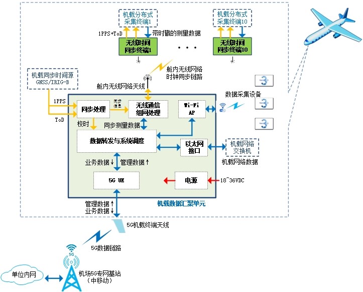 多體制高速無線網絡系統利用機載數據匯聚單元及配套的無線時間同步終端,將各分布式采集終端采集的測量數據,通過艙內無線網絡傳輸至數據匯聚單元;同時可將來自同步時間源(如GNSS或IRIG時鐘)的1PPS+TOD同步信息,通過艙內無線網絡高精度(10納秒級抖動)同步傳輸至各無線時間同步終端對外同步輸出,供分布式采集器作為數據采集的同步源,實現分布式并發同步數據采集。